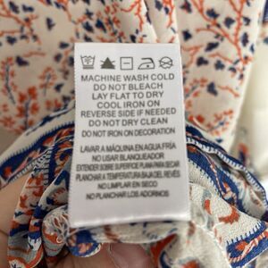 Love 8 semi-sheer bohemian peasant tunic. Ivory with blue and orange paisley design. Ruffled, 3/4 raglan sleeves, tie closure with tassels. Women's size L.