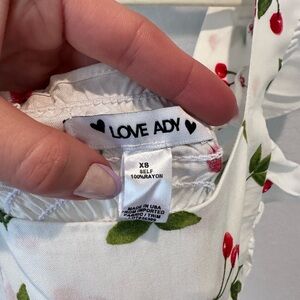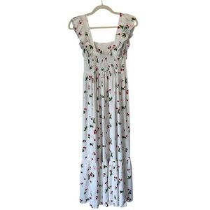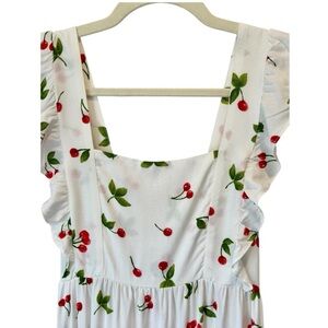 ✨ New without tags! Love Ady White Cherry Print Sleeveless Ruffle Maxi Dress with Smocked Back- with a square neckline and tiered hem.
