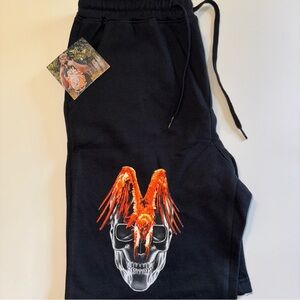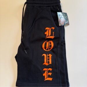 Black athletic shorts with striking skull and yellow 'LOVE' design. Ideal for sporty style.