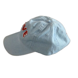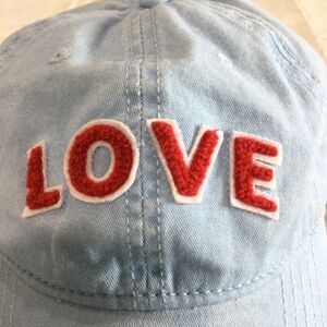 Love Raised Letters Distressed Light Blue and Red. Adjustable Cap. Please reference attached pictures for raised letters,faded Blue and red colors, condition and sizing strap.