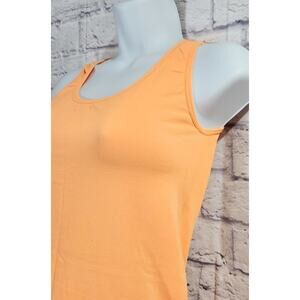 bright orange, round neck. sleeveless, lightweight, tagless, stretchy, soft, straight hem, wide straps