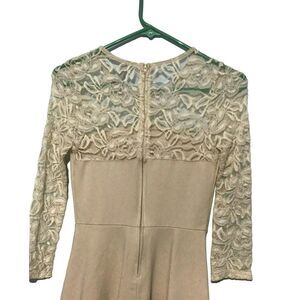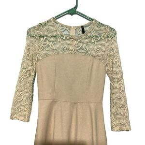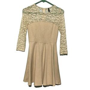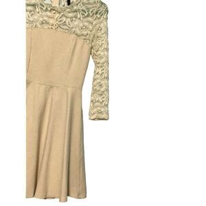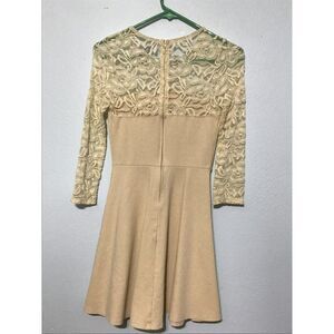 This women's medium cream lace mini dress by Love Culture features long sleeves, a delicate floral lace bodice, and a lightweight skirt for comfort.