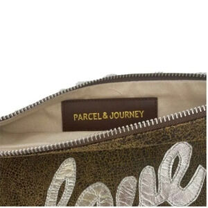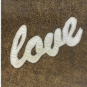 Distressed Leather Clutch with script "LOVE" in silver metallic leather on front