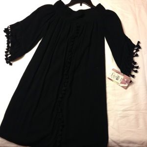 Love Fire black mini dress with tassel accents. Size extra small and 100% rayon. This is Rene modeling and she is about a size 3, however this fits me with plenty of room and I am a size 4 with 35" bust and 130lbs. New with tags.
