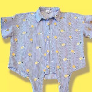 Love Fire Front Tie Ruffle Sleeve Pinstripe Blouse, embroidered lemon Size L/G
