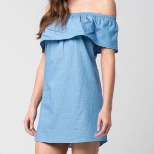 Love, Fire Off Shoulder Chambray Mini Dress Ruffle