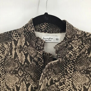 Nice Love Fire Reptile Twill bomber style jacket. Fabric is denim, with full zip front & two font pockets. Jacket has elastic hem, & elastic snap cuffs.