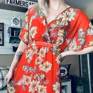 In good used condition. Only wore once to a wedding. Super bright orange maxi with Japanese inspired floral print. Has orange slip underneath that did become detached on one strap as shown but still fully functional. There was also a tie at the waist but I removed it because I didn’t like how it looked. Super comfortable and flattering dress for Summer events! Size small can also fit medium. I am 5’6/36B/145 lb for reference