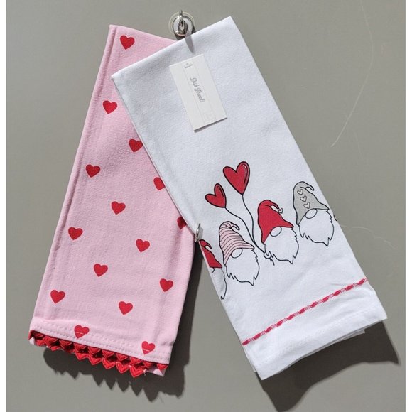 Love Gnomes & Red Heart Print Pink & White 2 Dish Towel Set 15" x 25" Each