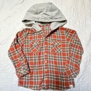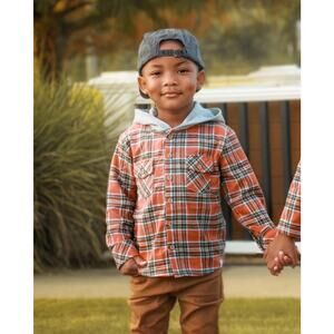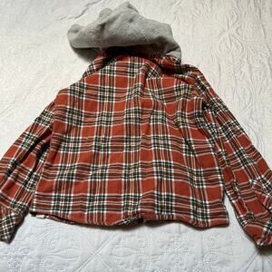 Love & Grow Turkey Day Tartan plaid button up hoodie. Fall plaid flannel shirt with hood - so soft! Play condition for missing top button - my kids didn’t button top so did not affect wear for us. Light wear otherwise. Size 7.