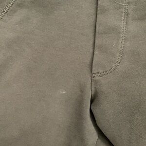 2 zip pockets on sides, 2 pockets in back, Elastic at ankles, olive green