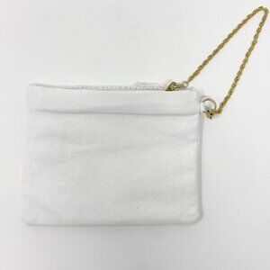 White beads on the front with gold love and red heart beaded detail. White cotton back and inside lining. Gold chain is removable.