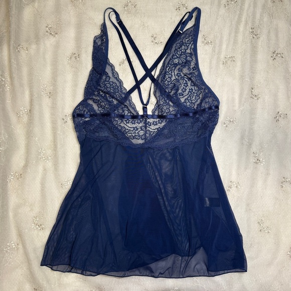 Indulge in the allure of this navy lace chemise, featuring a delicate strappy back design. Perfect for adding a touch of sophistication to your nightwear.