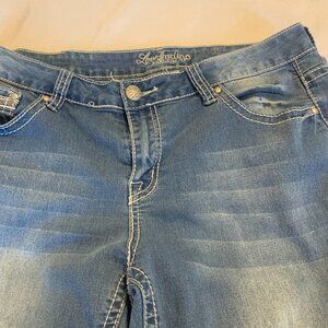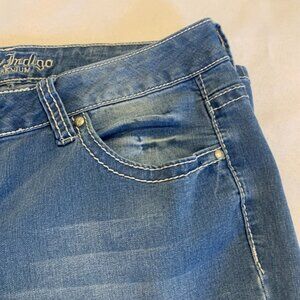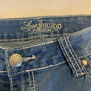 Love Indigo Size 12 lightweight jean capri pants featuring embellished back pockets. inseam length is 20 inches and shown in pictures