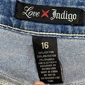 Love Indigo Size 16 Longer Length Embellished Distressed Denim Shorts Pearls. Cute pearl and silver stud detail on legs. Distressing on front leg and back pockets. Longer length. See photo(s) for measurements. Next business day shipping! Smoke free home!