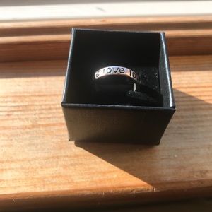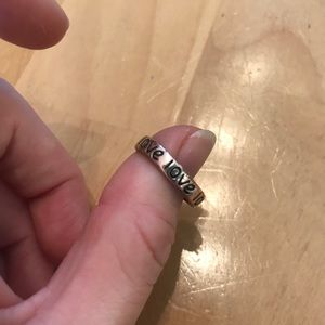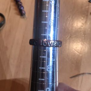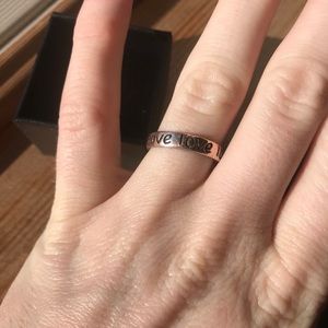 Copper “love” inscribed ring band. “Love” goes around the entire band. Some of the copper plating has faded to reveal the silver underneath.