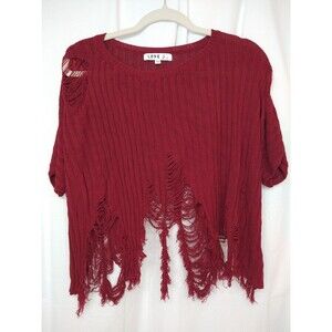 Love J Size M Distressed Cropped Short Sleeve Fringe Thrashed Red Wine Sweater