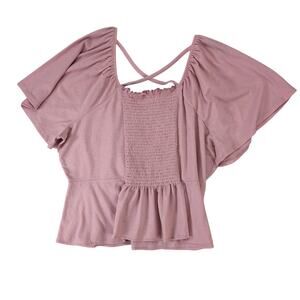 Features: Relaxed Fit, Short Sleeve, Off the Shoulder, Easy Care, Lightweight, Smocked, Solid Pattern, Pullover Closure, Button, Ruffle, Strap, Cropped Style, Machine Washable