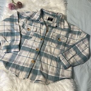 Green and cream colored button up Shacket. See measurements provided. Super cute and cozy!
