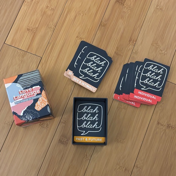 Explore meaningful conversations with the Love Language card game. Features a sleek black and white design.