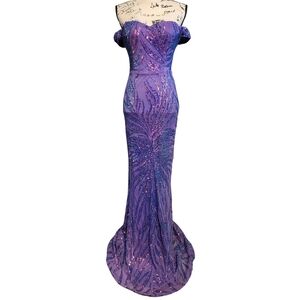 This exquisite purple gown features a ruched design and an off-the-shoulder neckline, ideal for cocktail events. Its sleeveless silhouette adds a touch of elegance, making it a perfect choice for prom or any special occasion.