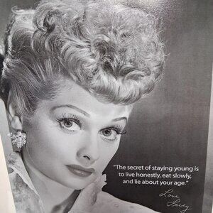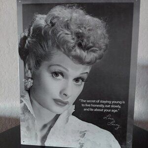The Love Lucy Secret of Staying Young Metal Tin Sign is a large, rectangular wall decor featuring Lucille Ball from the show "I Love Lucy." Measuring 17x21 inches, this gray sign is made of tin and metal, It is designed in a glam style with a matte finish, featuring a pictorial pattern of Lucille Ball and the theme of staying young. This Picture is retired and its Collectable and Rare making it a unique and nostalgic addition to any home or collection. the picture has been put in a Black Frame so its Ready to hang up...