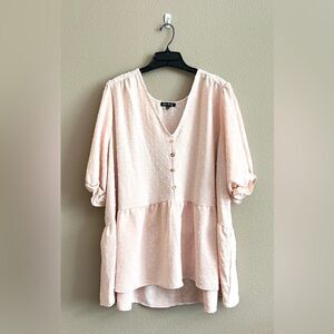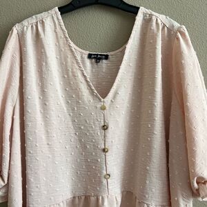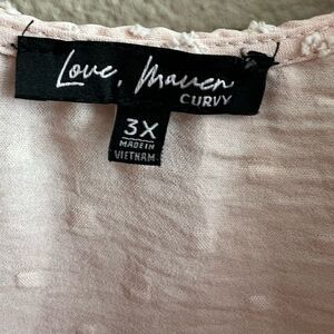 V neck. Button front detail. Ruffle trim on sleeves. Size 3X. In great condition!