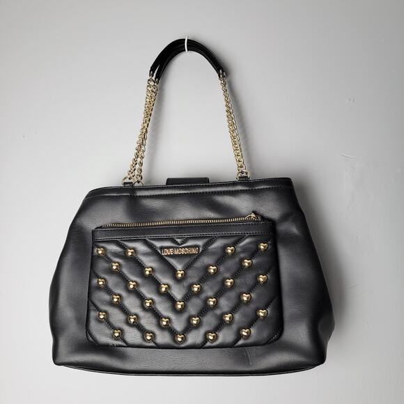 Love Moschino Black Studded Quilted Handbag Gold Chain Purse Heart Details Vegan