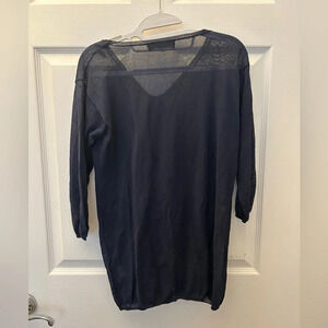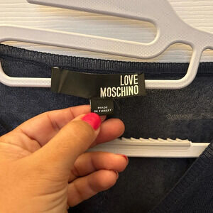 Love Moschino Bow embellished V Neck Blue size 6 Super-light, airy and delicately sheer, this Moschino top is the statement piece you need for your wardrobe. Embellished with a large bow and 3/4 sleeves Its the perfect piece special events, cool evening rendezvous, or brunch with friends.