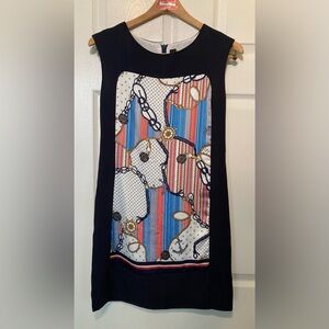 Love Moschino Size 2 Navy Nautical Dress. Navy dress with nautical design on front in red/white/blue/yellow tones. Back zipper. Excellent used condition with no callouts.