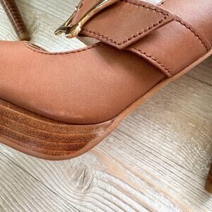 Love Moschino Leather Peep Toe Stacked Heel Mary Jane Pumps | Brown 39