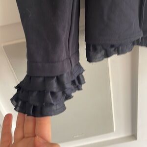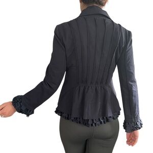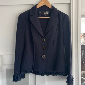 Beautiful Navy peplum back blazer by Live Moschino. Ruffles at sleeves and hem. Zippers at lower front reveal Ruffle underlayer. Size 8 US. Excellent condition.