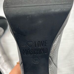 Authentic leather Love Moschino silver boots with bold black accents. Platform rubber sole. Size 8. Features a stylish heel and sleek design. Excellent condition - see photos