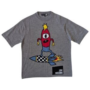 Love Moschino US 6 Wool Grey Knitwear Short Sleeve T-Shirt w/ Rocket Design