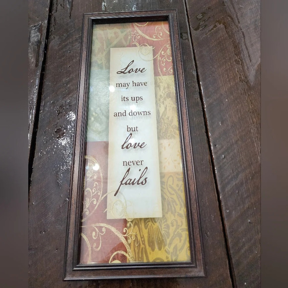 Long Rectangular framed picture with the words "Love may have its ups & downs but Love never Fails". Smoke free home. Has colors of maroon, golden yellow, and light blue.