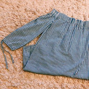 Love Notes dress. Off-the-shoulders. Size medium. Blue and white striped. Non-working buttons up the front. Elastic around the shoulder, so it stays up for you. 3/4. Tie detail on the cuff of the sleeve. 100% cotton. Great condition.
