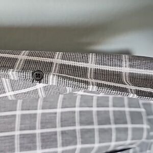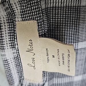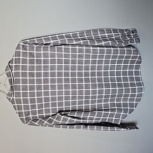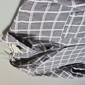 Black with white plaid. Buttons down the front. Roll tab sleeves. Textured fabric, doesn't stretch. Lightweight. From Anthropologie. Great condition. Shirttail hem. Pocket at the chest. High low style. workplace, brunch, neutral, grunge, weekend, brunch, academia, casual, mininalist