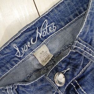 Women’s Juniors Love Notes Distressed Embellished Pockets Stretch Jeans. Item is in great pre-owned condition. No tears or stains. Size tag 5/6. Approximate Measurements Laying Flat