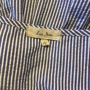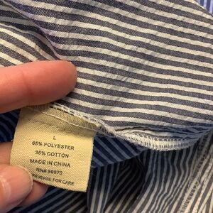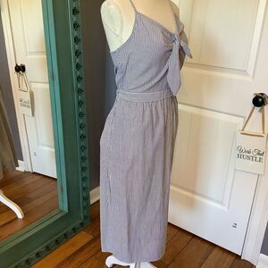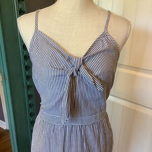 Adorable, dark gray-blue and white oxford striped dress with bow tie accent to chest. Back waist is elastic for extra comfort. Adjustable straps. Size large.