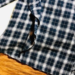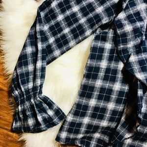 Navy and White plaid soft flannel blouse with ruffle detail on front and back with ruffle sleeves. Single button closure at the back of neck.