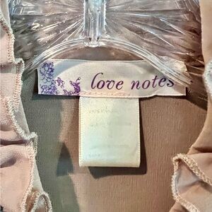 100% polyester Ruffle neckline Ties at top Mauve color Elbow length sleeves