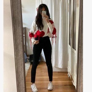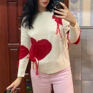Love One Another Heart Pattern Fringe Trim Sweater