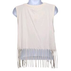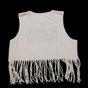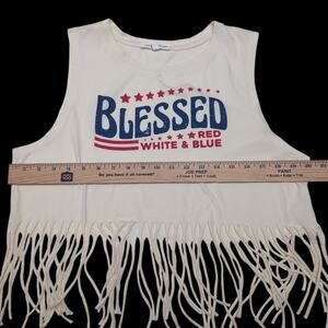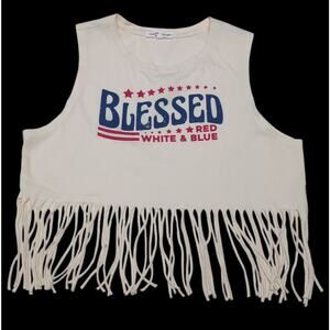Love Peace & Lazy Days Fringe Crop Top Jr Size XL Cream Blessed Red White Blue