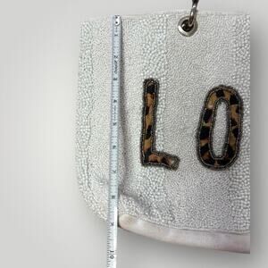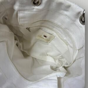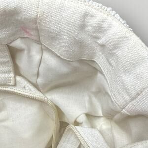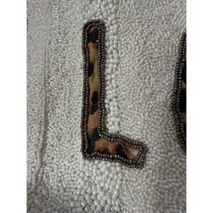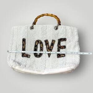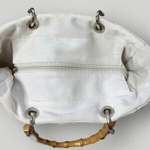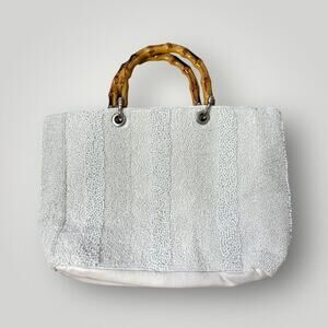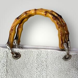 The bag shows some signs of wear - there are visible stains on the bottom and a few small marks inside the lining. All beads and handles are intact. Comes without dust bag or box.