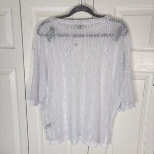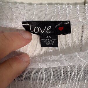 Elegant and versatile Love brand white sheer blouse in size 2X. Features a subtle wavy textured pattern and a lightweight, breathable mesh fabric perfect for layering. The relaxed silhouette flatters curves while keeping things breezy and comfortable.