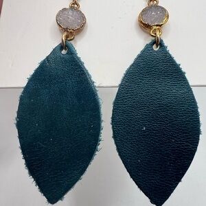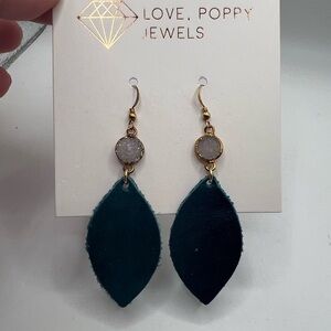 Love , Poppy Dark Green Teal Leather Teardrop with Druzy Stone Earrings NEW