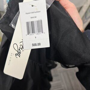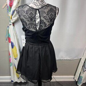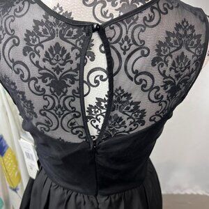 Love Reign by As U Wish black fit n flare mini dress. Front has blue black silver and gold sequins on bust. Back has mesh paneling and zipper closure. Tulle layering on skirt for added volume. Self 100% polyester. Contrast 100% nylon. Lining 100% polyester. Size 9