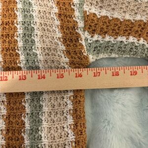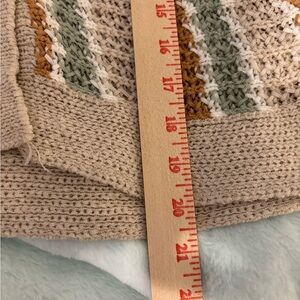 Stylish cardigan with button closure. Features beige, brown, and green stripes. Ideal for layering.