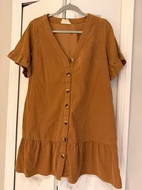 Love Riche Caramel Button-Front Ruffle Mini Dress