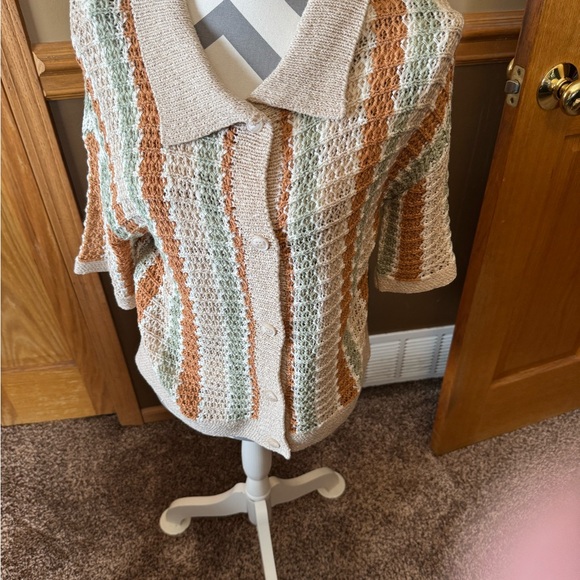 Chic button-up cardigan with textured stripes. Perfect for layering and casual wear.
